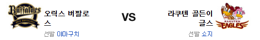 라쿠텐 골든 이글스는 쇼지 코세이(4승 4패 3.34)가 시즌 5승에 도전한다. 27일 오릭스 원정에서 7이닝 2실점의 호투를 하고도 타선의 부진으로 패배를 당한 쇼지는 최근 2경기에서 다시금 살아나는 모습을 보여주고 있는 중이다. 오릭스 상대로 홈에서 나름 강점도 있기 때문에 5~6이닝은 잘 버텨줄수 있을 것이다. 전날 경기에서 타카하시 코나의 실책 러쉬를 틈타 3점을 올린 라쿠텐의 타선은 비록 승리하긴 했지만 아직까진 타격이 좋다는 말을 하기엔 무리가 있는 편이다. 혼자서 3안타를 때려낸 루크 보이드는 무조건 재계약을 해야 할듯. 4이닝을 1실점으로 버틴 불펜은 코쟈 타츠키의 3이닝 1실점이 빛난다.