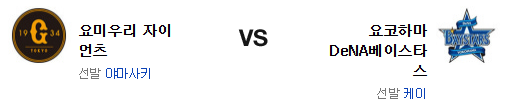 요코하마 DeNA 베이스타즈는 앤서니 케이를 1차전 선발로 마운드에 올린다. 30일 야쿠르트와 홈 경기엥서 2이닝 1실점의 투구 후 조기 강판을 당했던 케이는 4개의 볼넷이 말해주듯 제구난이 터진바 있다. 일단 요미우리 상대로 홈에서 극과 극의 투구를 보여주었는데 낮 경기 투구 내용이 아쉽다는 변수가 있다. 시즌 막판 좋은 타격감을 보여준 요코하마의 타선은 중심 타선의 호조가 팀의 활력소가 되고 있는 중. 특히 츠츠고 요시토모의 부황이 큰데 이제 관건은 주포 마키 슈고의 복귀 여부다. 하지만 이 팀의 불펜은 팀 최대의 약점인걸 모르는 사람은 없다.
