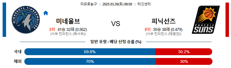 # 홈팀 : 미네소타 팀버울브스(41승32패)