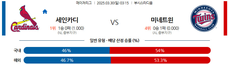 개막전은 양 팀의 집중력 차이가 확실히 드러난 경기였다. 현재로선 세인트루이스가 이 점에 있어서 한 단계 위에 있다고 해도 좋을듯. 페디와 라이언은 막상막하일지 모르지만 그 외의 부분은 분명 세인트루이스가 앞서 있는 편이고 마지막에 이 점이 빛을 발할것으로 보인다. 접전 끝에 마지막에 웃는건 세인트루이스가 될 것 같다. 다만 베팅을 권하고 싶은 경기는 절대로 아니다.