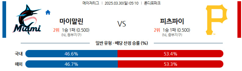 PIT : 작년 후반기에 부진했던 베일리 팔터가 마운드에 오른다. 작년 풀타임 선발로 뛰면서 8승 9패 4.43의 성적을 보여준 팔터는 전반기에 비해 후반기의 투구가 좋지 않은 투수. 작년 마이애미 원정에서 4이닝 6실점의 부진한 투구를 보여주었는데 작년보다 스프링캠프 투구가 좋았다는건 나름 기대를 걸게 하는 부분이다.