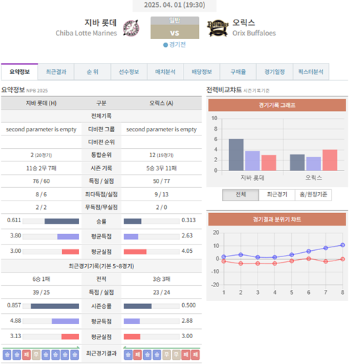 4월01일 일본야구(NPB) 지바롯데 VS 오릭스 [분석,추천]