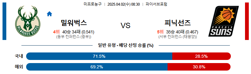 # 홈팀 : 밀워키 벅스(40승34패)