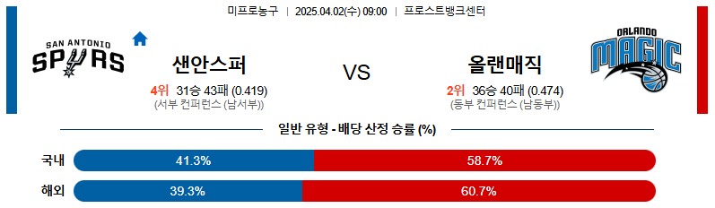 # 홈팀 : 샌안토니오 스퍼스(31승43패)