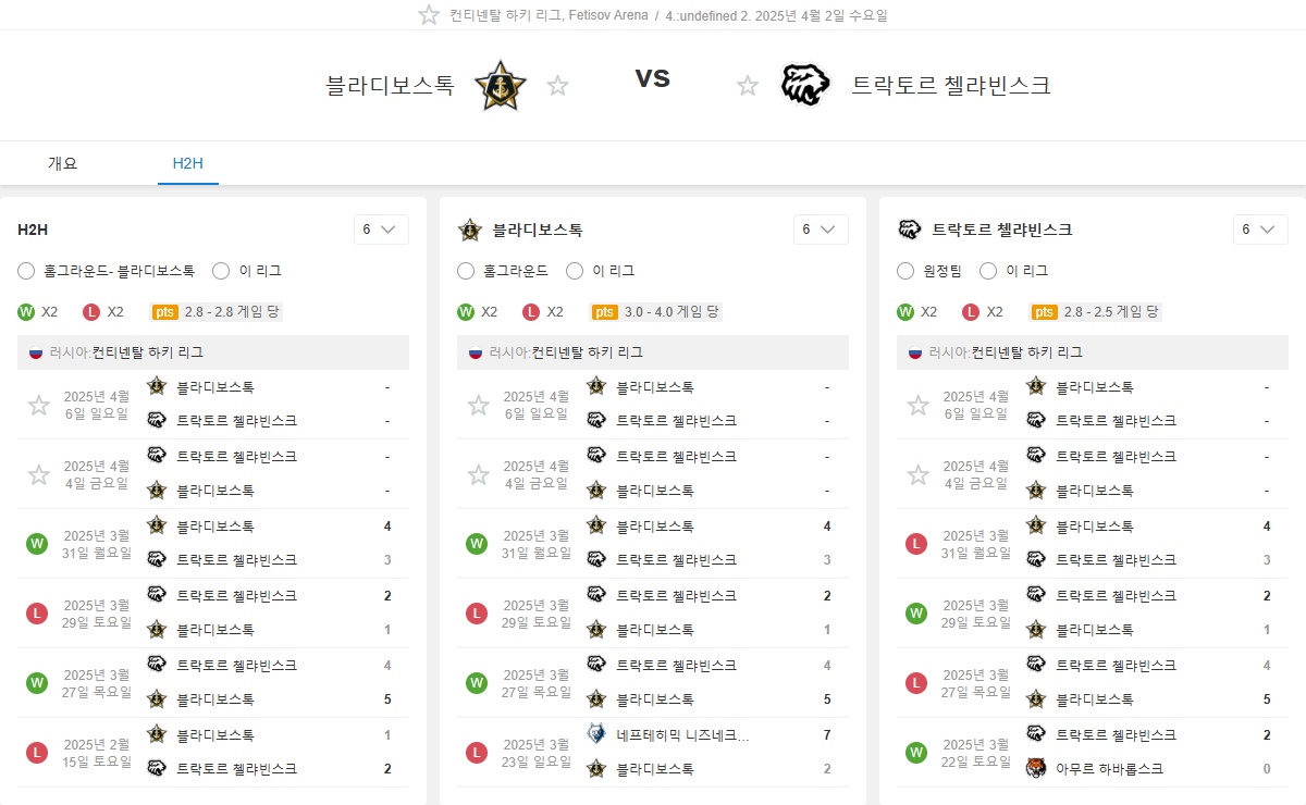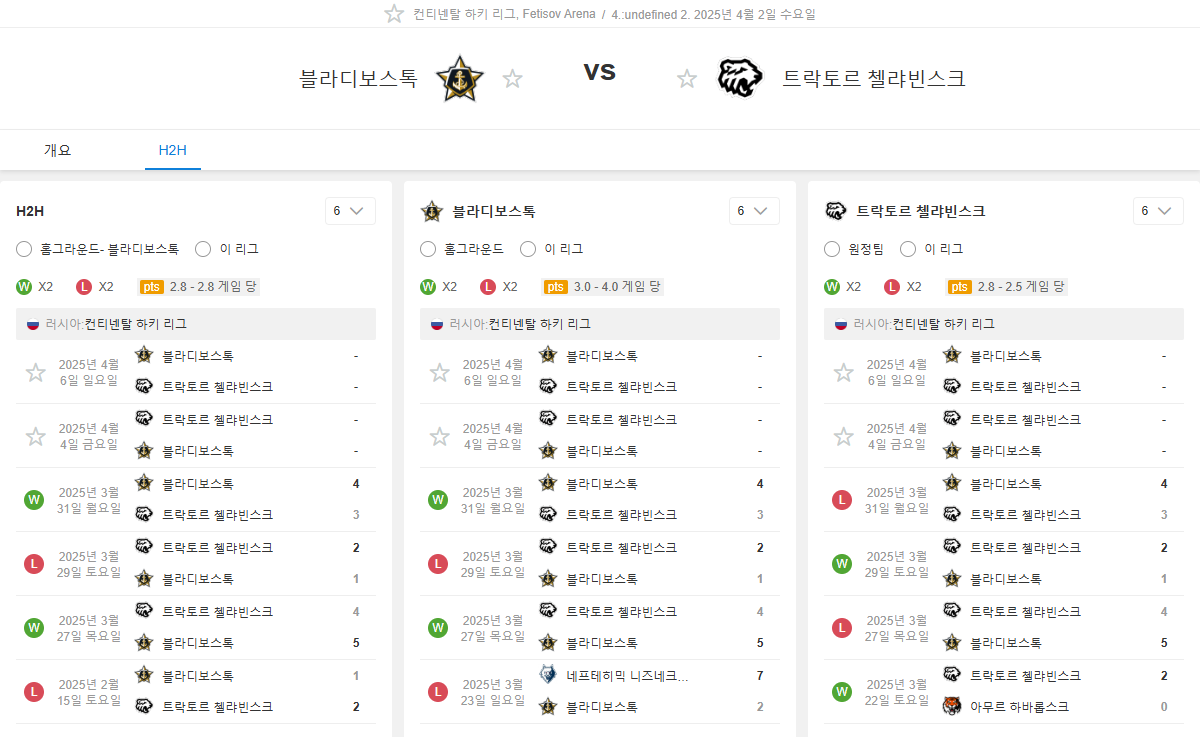 4월2일18:30 KHL 블라디보스토크 vs 트락토르 첼랴빈스크 아이스하키분석