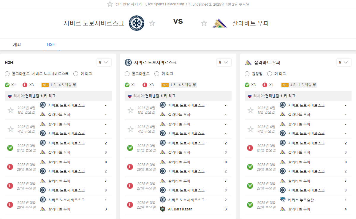 4월2일 21:30 KHL 시비르 노보시비르스크 vs 살라바트 우파 아이스하키분석