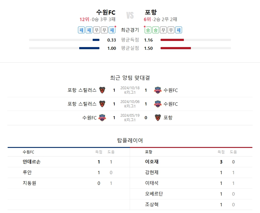 수원FC는 골 넣을 카드가 없고, 포항은 완성도와 흐름 모두에서 앞선다.