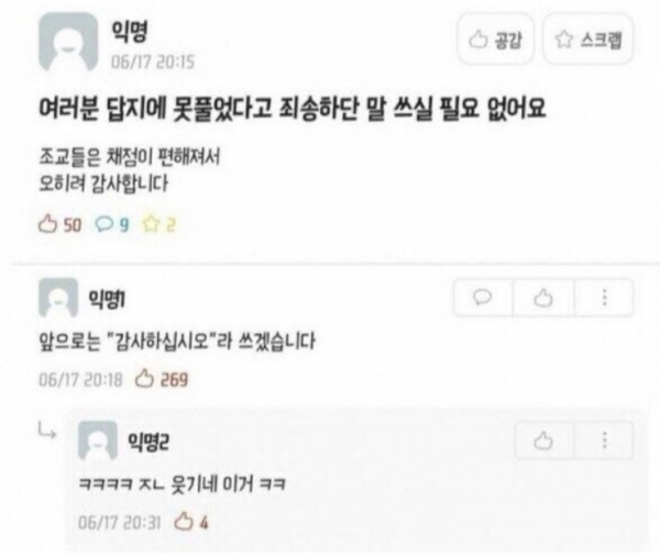 답안지에 문제를 못풀었다고 죄송합니다라 적지 마세요