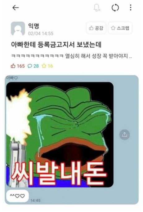 등록금 고지서를 본 아빠의반응 7 뚜리뚜리까뚜리 0 10 2025.10.20 19:53 ㅋ Author 1 0 Lv.7 7 뚜리뚜리까뚜리 골드 23,100 (12.5%) 등록된 서명이 없습니다.
