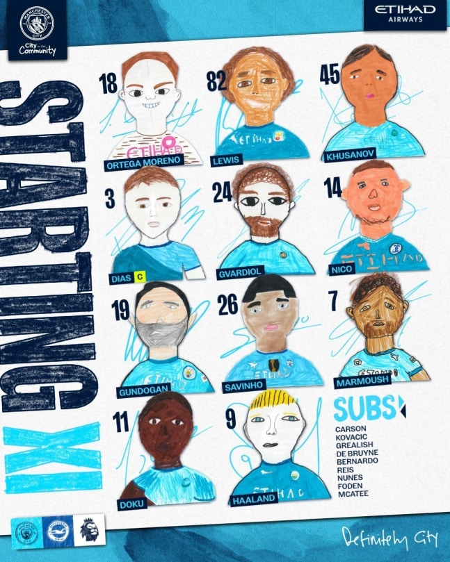 펩 과르디올라 감독이 이끄는 맨시티는 4-2-3-1 포메이션을 가동했다. 슈테판 오르테가가 골문을 지켰고, 요슈코 그바르디올-후벵 디아스-압두코디르 후사노프-리코 루이스가 백4를 구축했다. 3선에 니코 곤잘레스와 일카이 귄도안, 2선에 제레미 도쿠-오마르 마르무시-사비뉴가 포진했고, 최전방 원톱에 엘링 홀란이 나섰다.