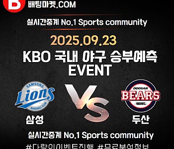 ★ 09월 23일[KBO] 삼성라이온즈 VS 두산베어스 승/패★ 09월 23일 [KBO] 삼성라이온즈 VS 두산베어스언더/오버★총 상금5,300P★승패/언더오버 를 정확히 맞춰주신…