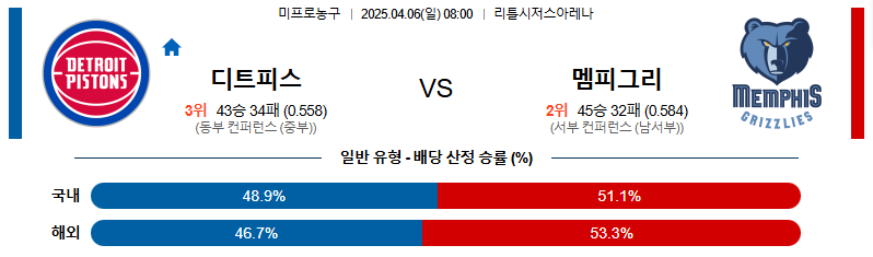 # 홈팀 : 디트로이트 피스톤스(43승34패)
