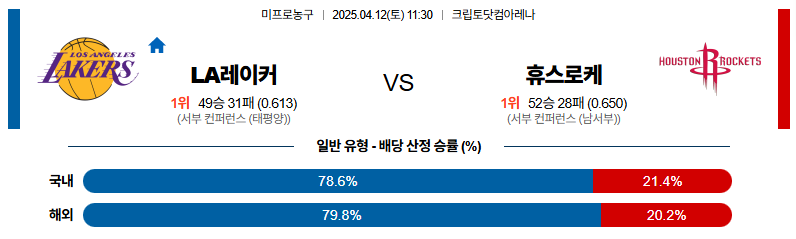 서부 2번 시드를 확정한 휴스턴은 주축 선수들의 출전 시간을 대폭 줄이는 선수 운영을 보이고 있다. LA레이커스가 홈에서 승리를 가져갈 것이다.
