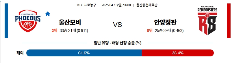 # 홈팀 : 울산 현대모비스(33승21패, 정규시즌 3위)