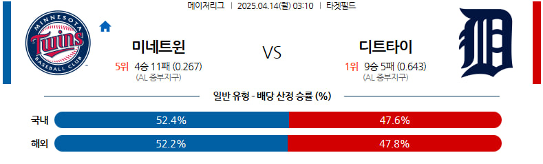 MIN : 시미언 우즈 리차드슨(1패 5.59)이 시즌 첫 승에 재도전한다. 8일 캔자스시티 원정에서5.2이닝 8안타 4실점의 투구로 패배를 당한 리차드슨은 작년의 위력을 전혀 재현하지 못하고 있는 중이다. 작년 디트로이트 상대로 홈에서 부진하고 원정에서 강했는데 그나마 낮 경기 투구가 좋다는 점에 승부를 걸어야 한다.