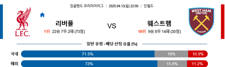 리버풀은 다소간의 부상 이슈에도 불구하고 압도적인 공격 전개 완성도와 홈에서의 강세가 매우 뚜렷한 팀이다. 웨스트햄은 수비 중심 자원들의 결장과 중원 미스매치 문제로 인해 경기 흐름을 따라가기조차 벅찰 가능성이 높다. 이번 경기는 리버풀이 홈에서 여유 있게 승리를 챙길 가능성이 매우 높은 매치업이다.
