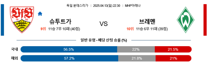 독일 분데스리가】04월13일 VfB 슈투트가르트 vs SV 베르더 브레멘