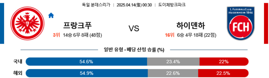 프랑크푸르트는 2선 전개부터 마무리까지 탄탄한 전술적 구조를 바탕으로 경기 주도권을 쉽게 가져갈 수 있는 팀이다. 에키티케와 괴체를 중심으로 한 공격 전개가 하이덴하임의 수비 라인을 계속해서 압박할 수 있다. 반면 하이덴하임은 단일 전술 구조로 버티는 수밖에 없는 상황이며, 반격 루트와 득점 시나리오가 제한적인 편이다. 종합적으로 프랑크푸르트의 전력 우세가 두드러지는 매치업이다.