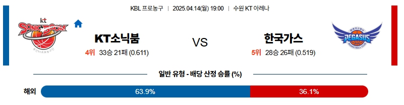 플레이오프 1차전에서는 KT가 홈에서 64-67로 패했다. 해먼즈가 4득점 7리바운드로 부진한 반면, 가스공사에 유일한 용병으로 나섰던 마티앙은 14득점 21리바운드로 제공권 및 수비에서 제 몫을 해냈다. 그래도 이번 경기까지 가스공사의 니콜슨이 결장하는 가운데, 마티앙에 대한 적응 및 대처가 어느정도 이뤄질 이번 경기에서는 KT가 반격에 성공할 가능성이 높아보인다. 언더 양상 속 KT의 5점차 이내 승리를 예상한다.