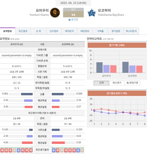 4월 15일 일본야구(NPB) 요미우리 VS 요코하마 [분석,추천]