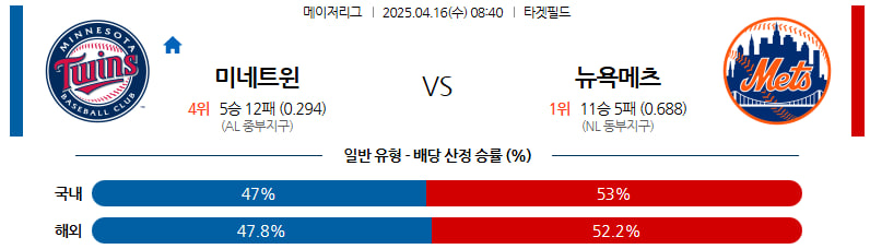 04월 16일 MLB 미네소타 뉴욕메츠 분석