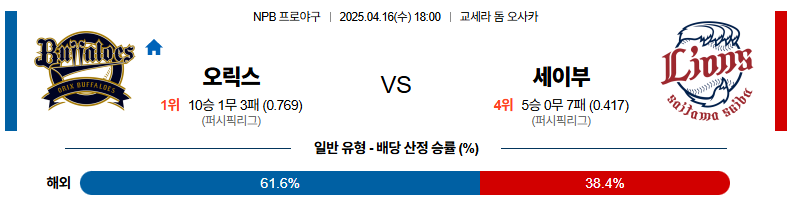 4월 16일 일본야구(NPB) 오릭스 VS 세이부 [분석,추천]