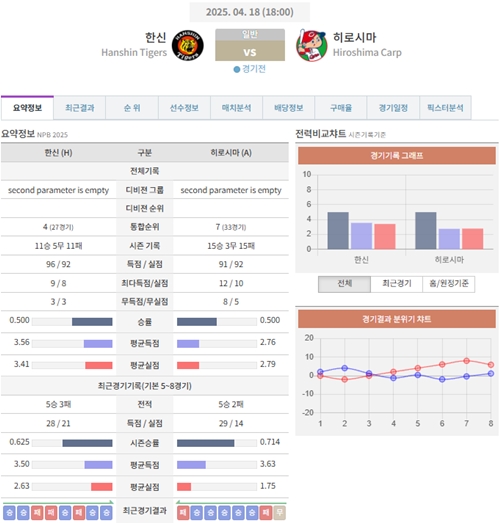 4월 18일 일본야구(NPB) 한신 VS 히로시마 [분석,추천]