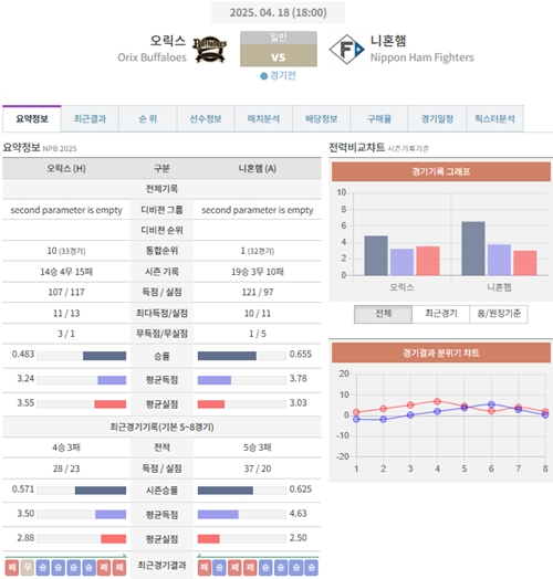 4월 18일 일본야구(NPB) 오릭스 VS 니혼햄 [분석,추천]