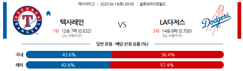 TEX : 제이콥 디그롬(4.30)이 시즌 첫 승에 재도전한다. 12일 시애틀 원정에서 4이닝 3실점의 부진한 투구를 보여준 디그롬은 첫 등판을 제외하면 전성기의 위력이 나오지 않고 있다. 이번 경기가 홈이라는건 그나마의 강점이지만 5이닝이 한계일수 있다.