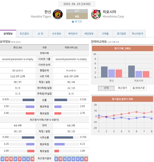 4월 19일 일본야구(NPB) 한신 VS 히로시마 [분석,추천]