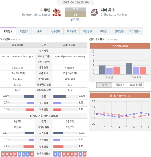 4월 19일 일본야구(NPB) 라쿠텐 VS 지바롯데 [분석,추천]