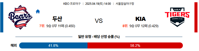 전날 경기는 콜 어빈이 그냥 경기를 지배했다는 표현이 잘 어울리는 경기였다. 그만큼 어빈이 KIA의 타선을 잘 요리한것. 물론 최원준이 홈 낮 경기에 강한 투수이긴 한데 올러 역시 낮 경기라면 나름 일가견이 있는 투수다. 그리고 KIA는 마무리까지 가는 길에 카드 한 두장 정도는 있는 반면 두산은 1장 뿐이고 그나마도 전날 썼다. 투수력에서 앞선 KIA가 신승을 거둘 것이다.