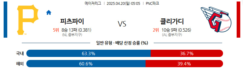 04월 20일 MLB 피츠버그 클리블랜드 분석
