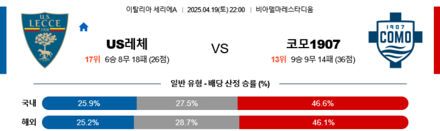 코모가 전술 완성도와 조직력 측면에서 앞서지만, 원정이라는 점과 레체의 수비 지향적 운영을 감안할 때 무승부 가능성이 크다. 다득점 경기보다는 조직력 기반의 신중한 흐름이 예상된다.