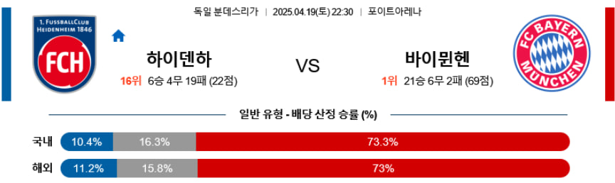 하이덴하임은 홈 경기에서 라인을 내리고 버티는 전략을 구사하겠지만, 뮌헨의 공격 라인과 중원 장악력에 밀릴 가능성이 크다. 도르쉬(MF)의 카드 관리 이슈도 수비 전환에 부담을 주며, 뮌헨은 케인(FW)을 중심으로 세컨볼과 측면 침투를 통해 경기를 풀어갈 것이다. 단, 챔스 일정 병행에 따른 체력 관리와 하이덴하임의 홈 끈기는 언더 양상의 경기를 유도할 수 있다. 결과적으로 뮌헨의 승리가 유력하다.