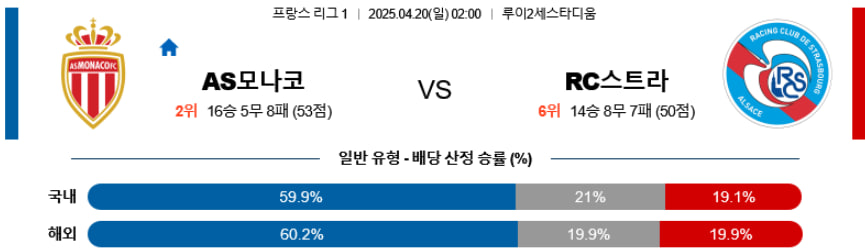 모나코는 강한 중원 압박과 정교한 패턴 플레이를 바탕으로 경기를 주도할 가능성이 높지만, 스트라스부르의 속공 전개와 후반 집중력은 결코 가볍지 않다. 수비 전환에서의 리스크가 남아있는 모나코, 결장자 이슈에도 불구하고 공세를 유지하는 스트라스부르의 맞대결은 팽팽하게 전개될 공산이 크다. 무승부 가능성과 함께 다득점 흐름이 예상된다.