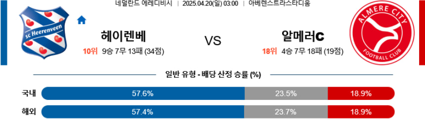 헤이렌베인은 수비 라인의 핵심 결장과 중원 탈압박 취약이라는 구조적 약점이 지속되고 있으며, 자한바크슈(FW)의 개인 의존도 또한 공격 전개의 단조로움을 부추기고 있다. 알메러 시티는 후방 안정성과 빠른 전환을 바탕으로 최소 무승부를 노릴 수 있는 경기 흐름을 예고하고 있으며, 후반 체력 저하를 감안해도 라인을 지키는 데 집중할 가능성이 높다. 양 팀 모두 공격력에서 폭발력이 떨어지기 때문에 언더 흐름과 함께 무승부 가능성이 현실적이다.