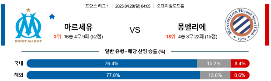 양 팀 모두 기대 이하의 흐름을 보이고 있으나, 마르세유는 그래도 수비 조직을 일정 수준 유지하고 있고, 몽펠리에는 전방과 후방 모두 완전히 붕괴된 상태다. 마르세유가 수비적으로만 흔들리지 않는다면 홈 이점과 상대 공백을 활용해 승점 3점을 가져갈 가능성이 높다. 단, 다득점 양상은 어려우며 언더 접근이 유효하다.