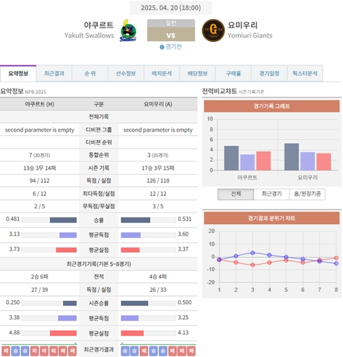 4월 20일 일본야구(NPB) 야쿠르트 VS 오미우리 [분석,추천]