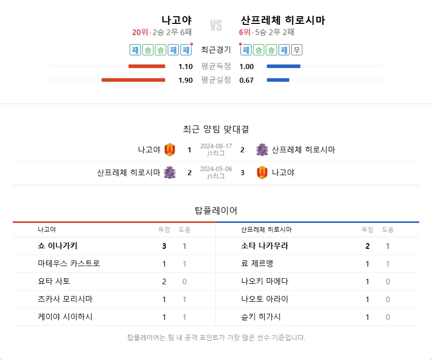 양 팀 모두 불안 요소가 분명하며, 수비 안정 우선 전술로 조심스러운 운영이 예상된다. 나고야는 득점 루트가 단조롭고 히로시마는 결정력에서 한계가 있다.