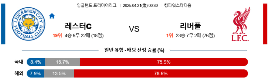 레스터시티는 수비 집중력 붕괴와 체력 저하가 겹치면서 후반전 대량 실점이 반복되고 있다. 측면 수비수의 복귀 지연과 중원 압박 부재는 리버풀의 속공 흐름에 치명적인 약점으로 작용할 수 있다. 리버풀은 측면과 중앙을 고르게 활용한 전개와 함께, 후반 교체카드의 즉각적인 효과로 경기 마무리 능력이 매우 뛰어나다. 레스터 입장에선 홈 어드밴티지를 활용한 대응도 쉽지 않으며, 리버풀의 압박과 템포 변화에 고전할 가능성이 높다.