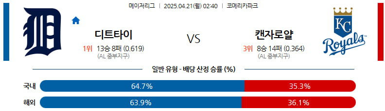 04월 21일 MLB 디트로이트 캔자스시티 MLB분석