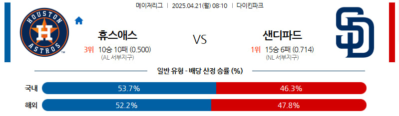04월 21일 MLB 휴스턴 샌디에이고 분석