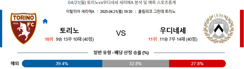 【세리에A】04/21(월) 토리노vs우디네세