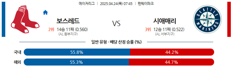 베이오의 복귀전은 성공적이었고 보스턴의 타선은 살아났다. 전날 경기는 보스턴에게 있어서 이보다 더 좋을수 없는 결과물이라고 해도 좋을 듯. 게다가 밀러 뒤에 바로 행콕이 나온다는건 투구 스타일 때문에라도 그렇게 좋은 선택은 아니고 보스턴은 우완 투수 상대로 나름 버텨주는 팀이다. 반면 시애틀은 좌완 상대로 정교함이 많이 떨어지는 편이고 불펜은 언제 흔들려도 이상하지 않다. 전력에서 앞선 보스턴 레드삭스가 승리를 가져갈 것이다.