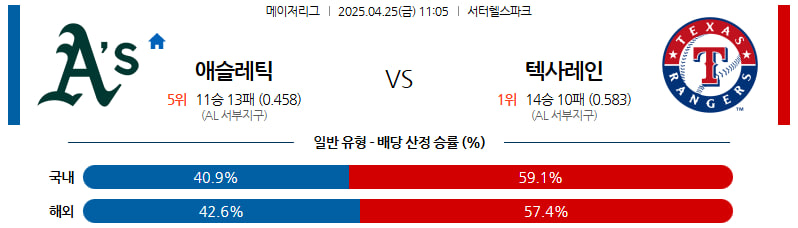 04월 25일 MLB 애슬레틱스 텍사스 분석
