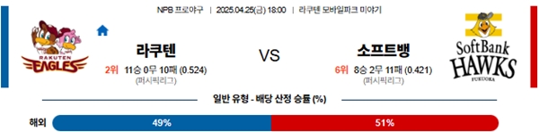 4월 25일 일본야구(NPB) 라쿠텐 VS 소프트뱅크 분석