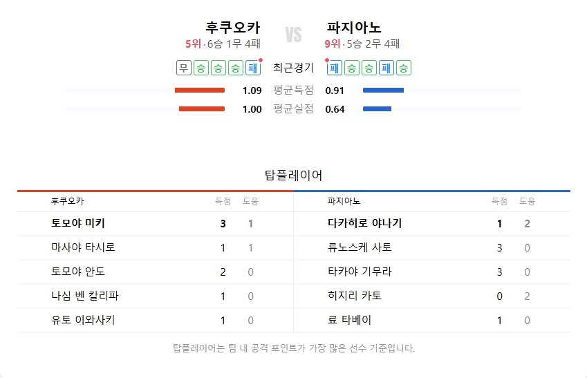 양 팀 전력은 유사하나, 후쿠오카는 자헤디(FW) 의존도와 후반 집중력 문제로 인해 단기 흐름에서 확실한 우위를 점하기 어렵다. 오카야마는 체력 운영과 전술 유연성, 그리고 루카오(FW)를 중심으로 한 득점 루트 다변화에서 비교적 안정감을 보인다. 후쿠오카의 강한 압박과 전개 속도는 위협적이지만, 오카야마의 응수 능력도 만만치 않아 저득점 무승부 시나리오가 유력하다.