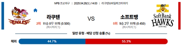 4월 26일 일본야구(NPB) 라쿠텐 VS 소프트뱅크 분석