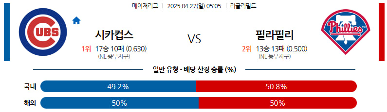 컵스의 기세는 그야말로 미칠듯한 레벨이다. 러자르도가 최근 대단히 좋은 투구를 하고 있긴 하지만 낮 경기라는 변수가 있는 상황. 게다가 컵스는 좌완 상대로 대단히 강한 팀이기도 하다. 브라운의 투구는 조금 로또에 가깝긴 하지만 최그느이 필라델피아 타선을 고려한다면 좋은 흐름은 이어갈수 있을 것이다. 전력에서 앞선 시카고 컵스가 승리를 가져갈 것으로 본다.